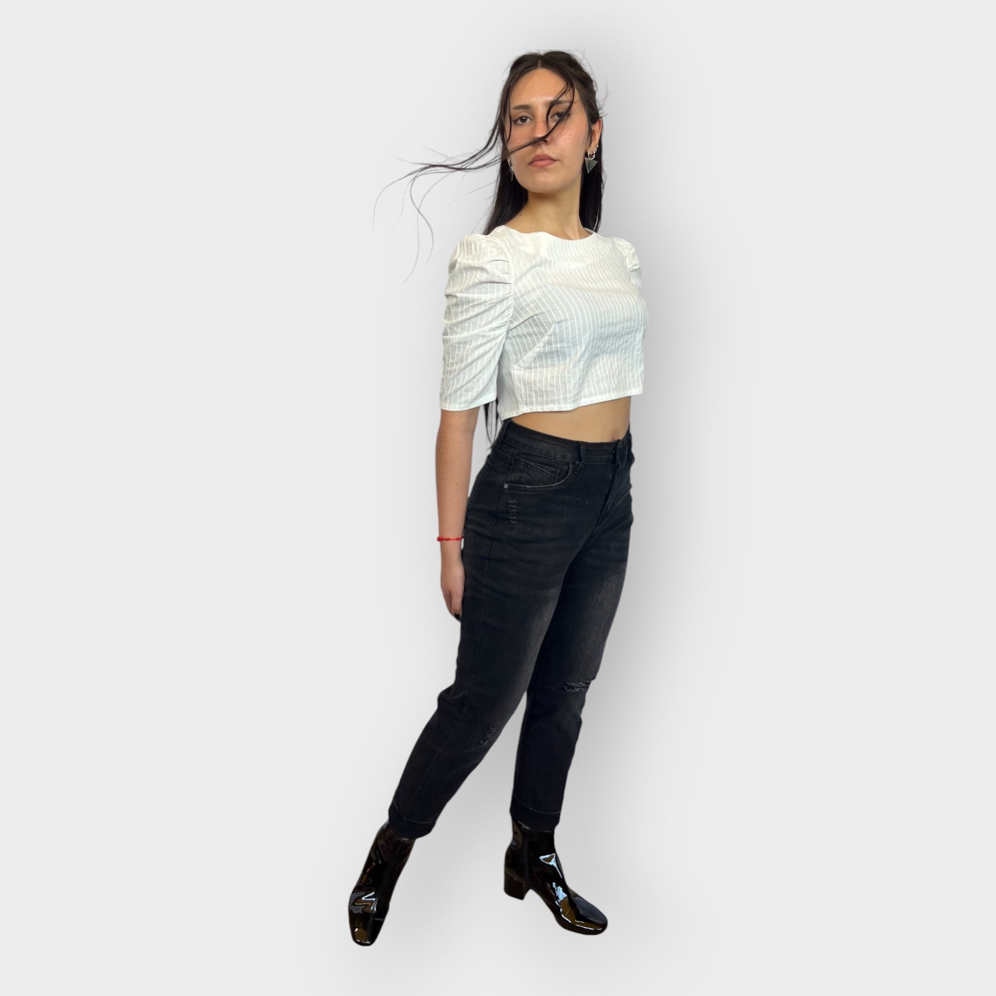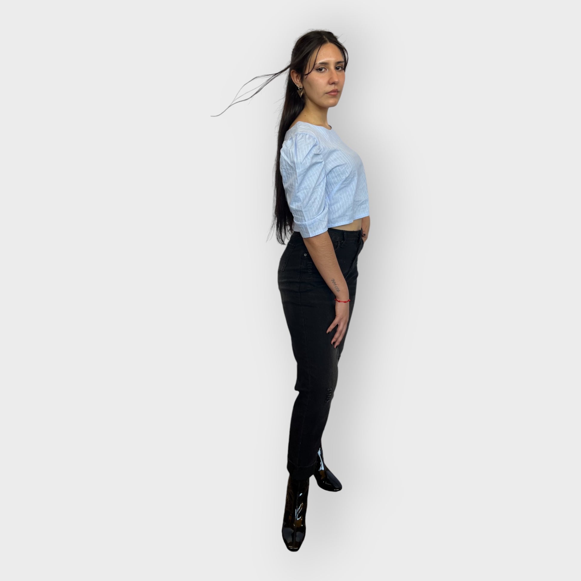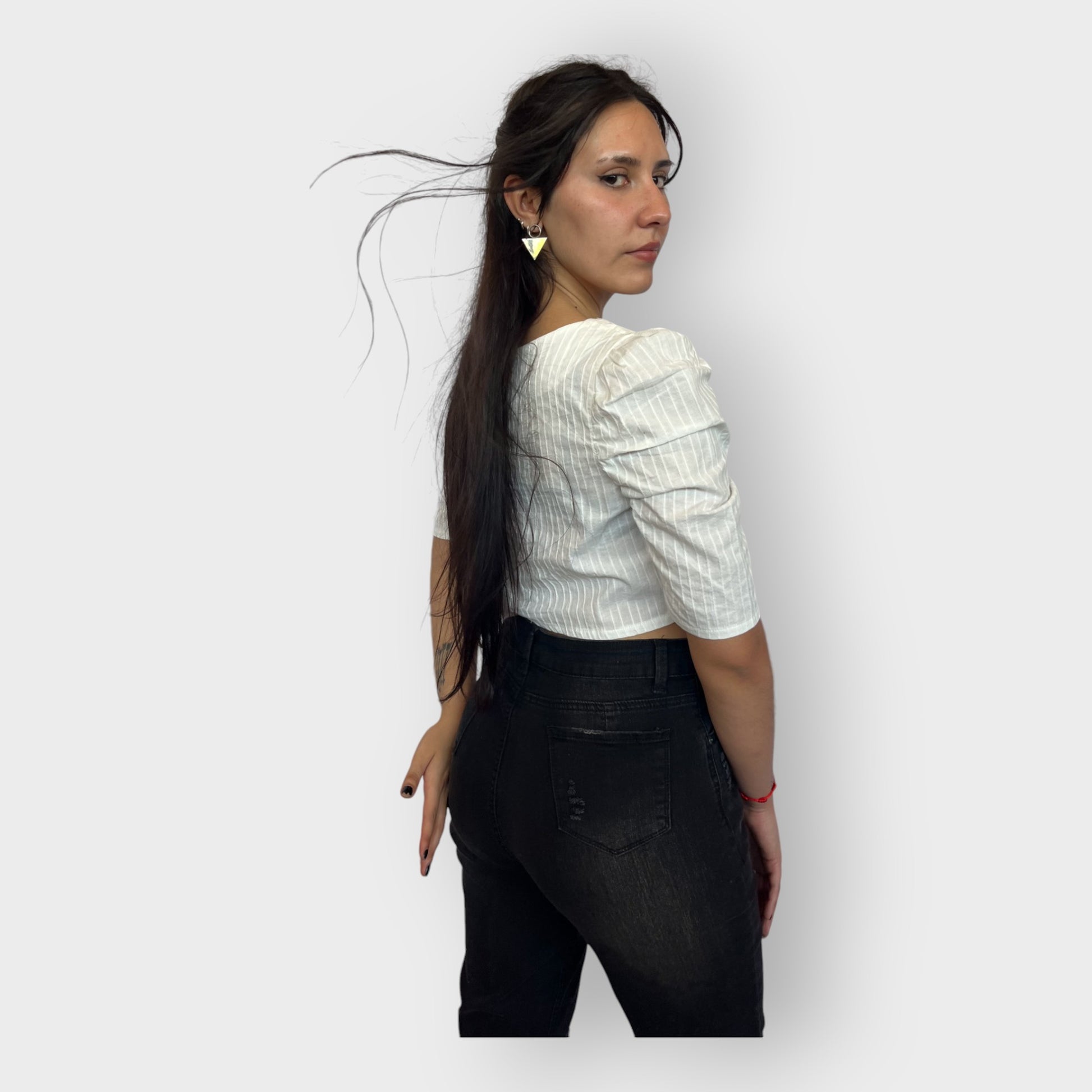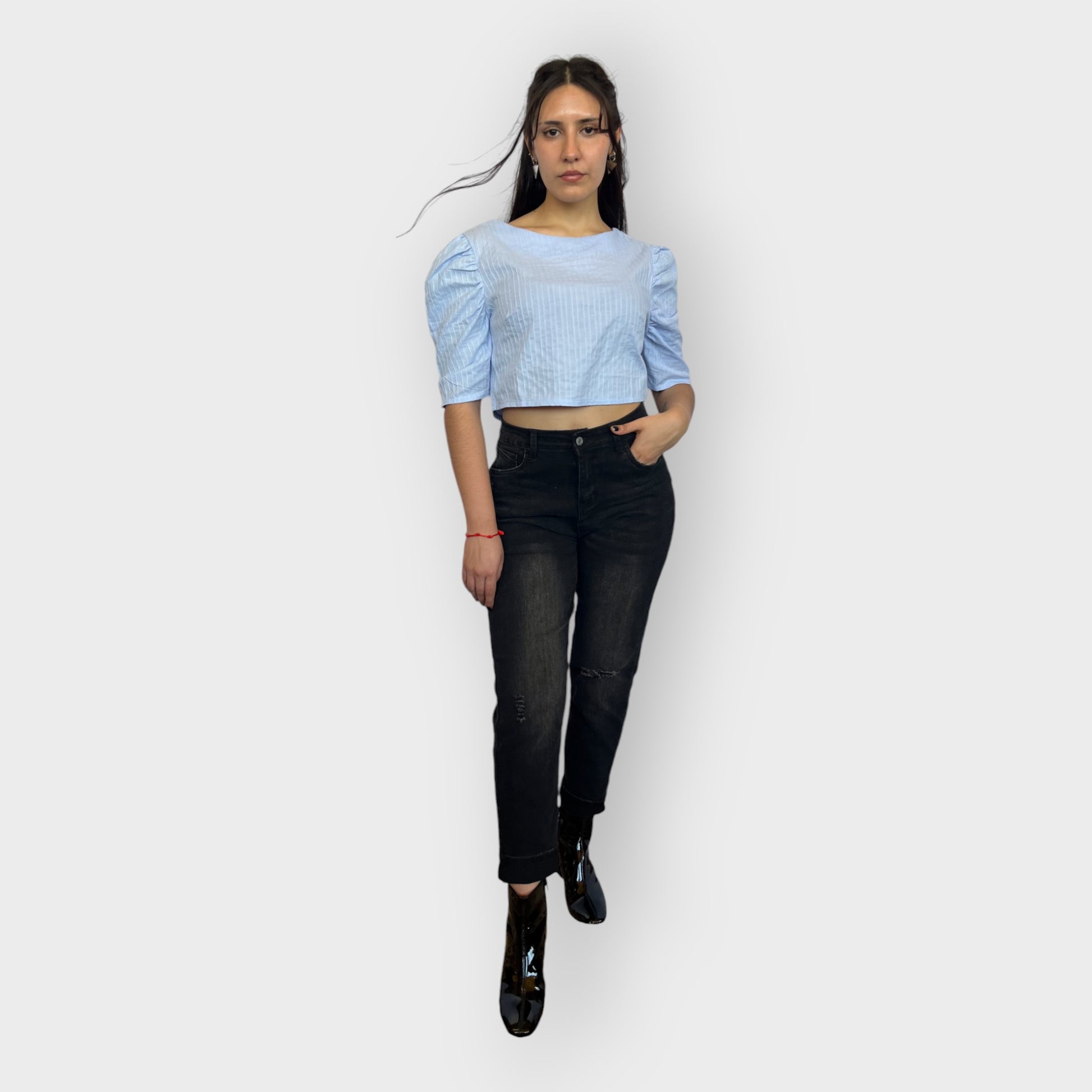 Esta blusa de ORA destaca por su elegante diseño de escote a la base y mangas abullonadas hasta el codo, terminando en un elegante puño que añade un toque moderno. La silueta corta hasta la cintura la hace versátil y perfecta para adaptarse tanto a looks casuales como formales. Su tejido fresco la convierte en una opción ideal para cualquier época del año. Disponible en los clásicos colores azul claro, negro y blanco, es una prenda imprescindible para quienes buscan estilo y comodidad en una sola pieza.