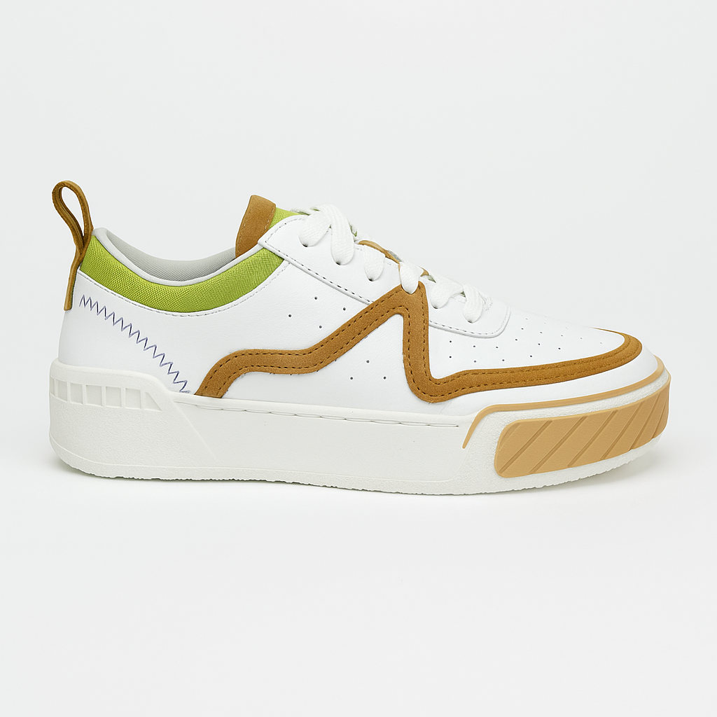 Diseño: Suela recta con detalles en mostaza y verde oliva.