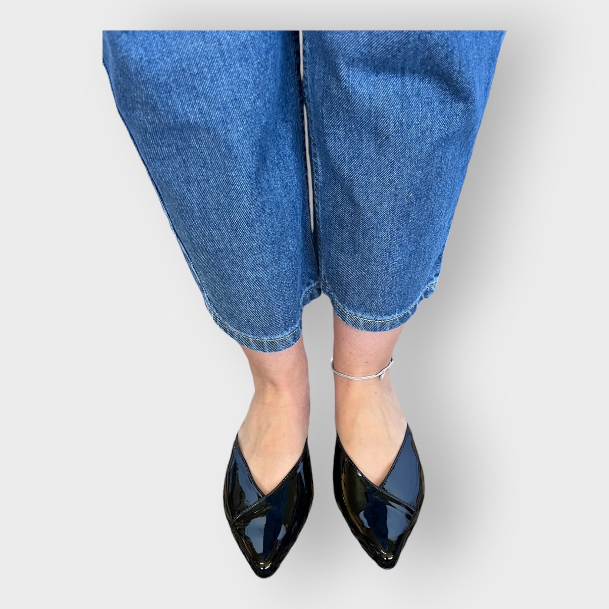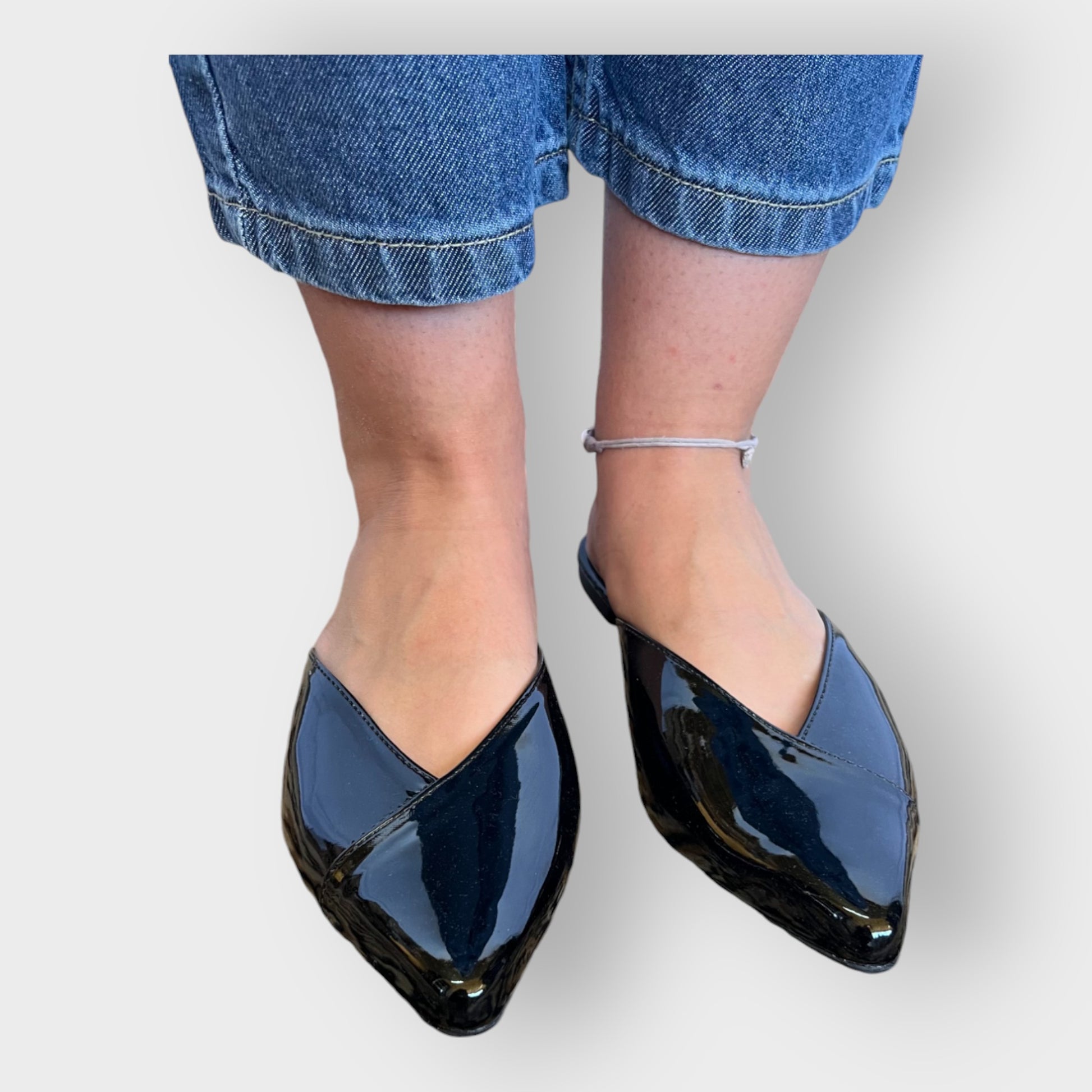 - Punta cerrada en forma afilada, con un corte en "V" que estiliza el pie.