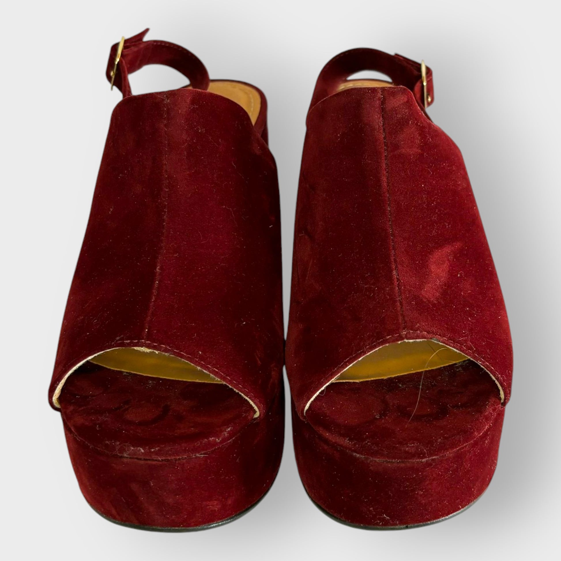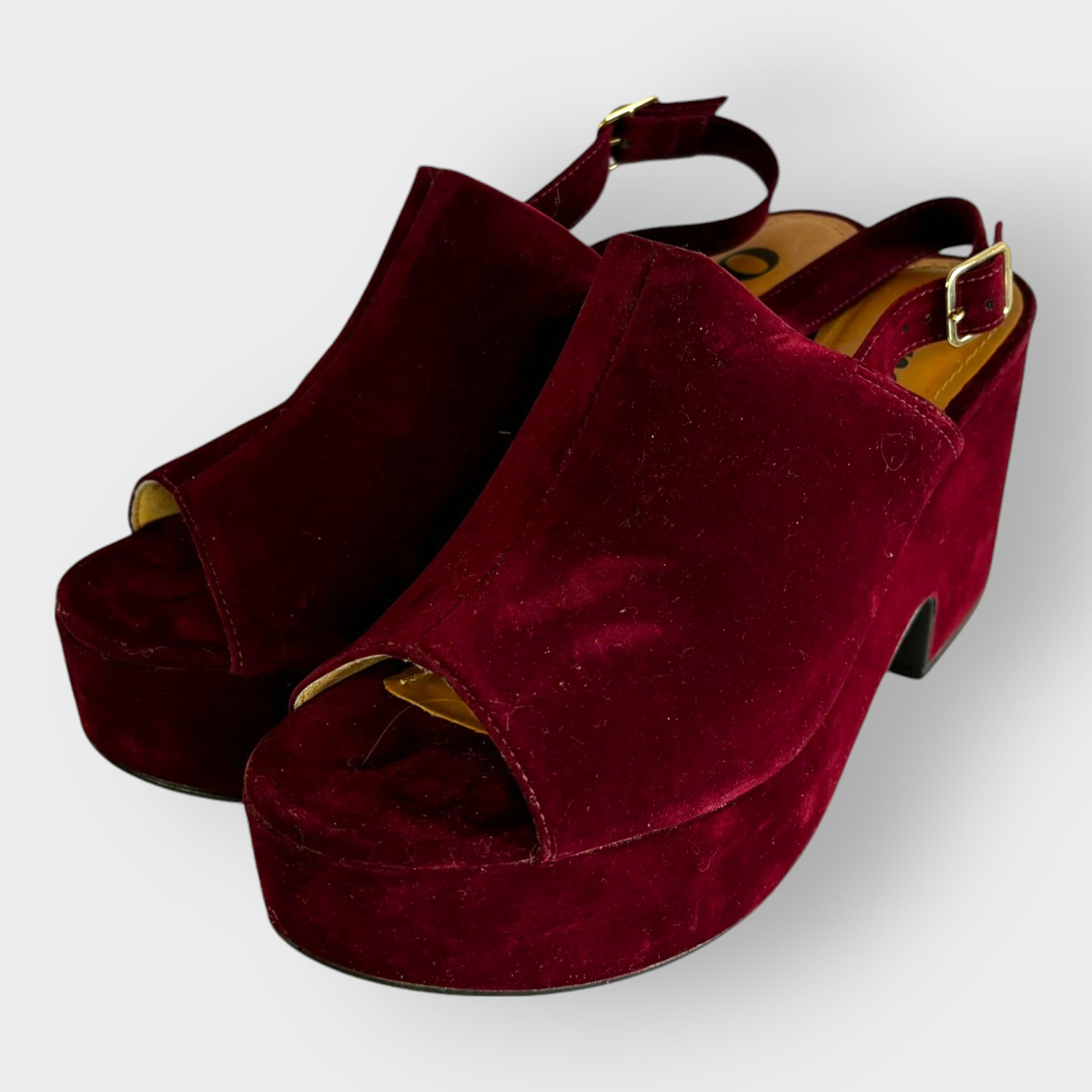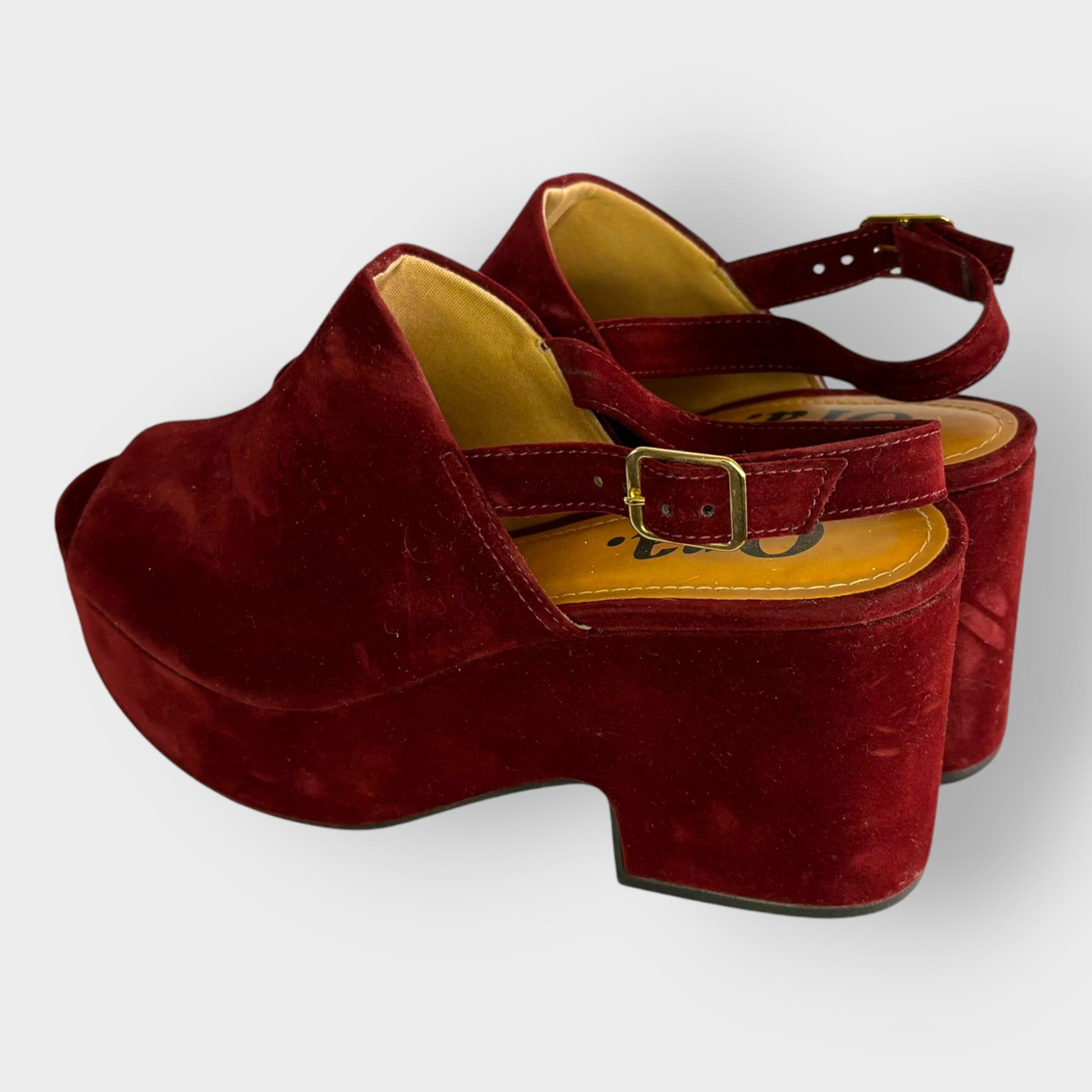 Color bordeaux: Una opción audaz y llamativa, en un elegante tono burdeos que añade un toque de distinción a cualquier atuendo. Al igual que la variante negra, está hecha de un material suave y aterciopelado, y cuenta con detalles cuidados como la hebilla dorada y una cómoda plataforma.