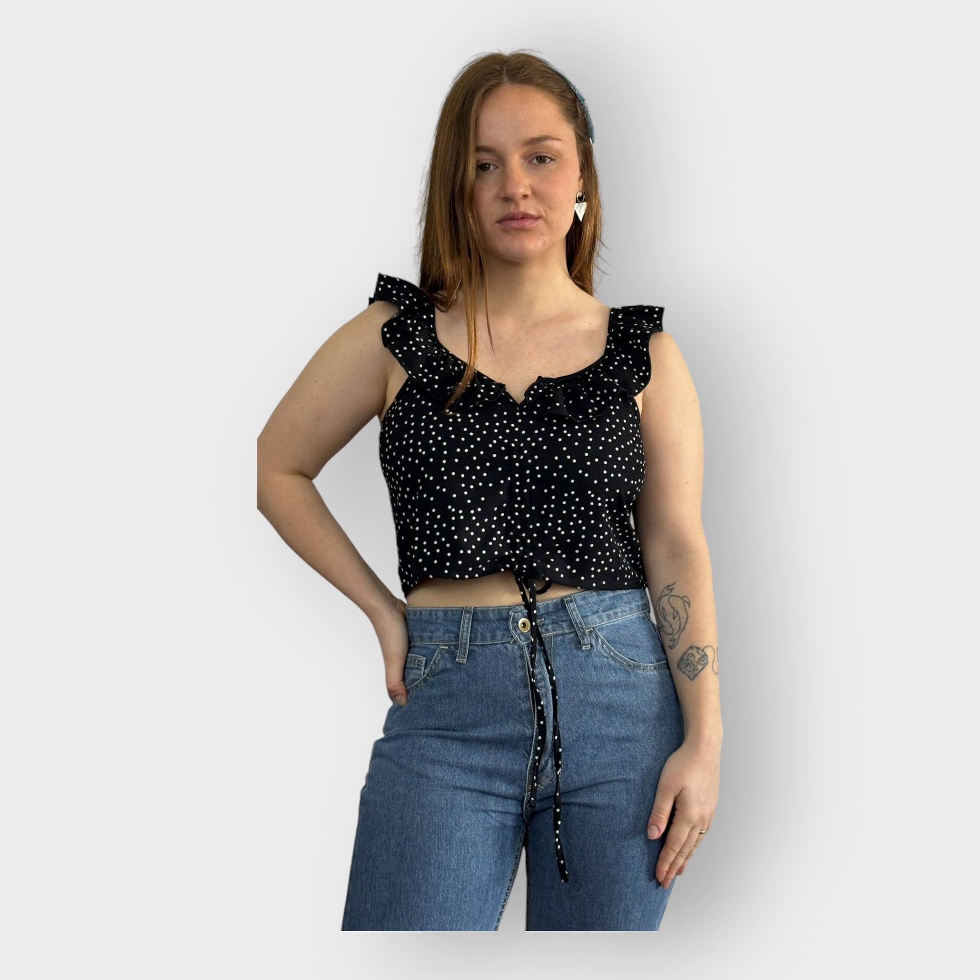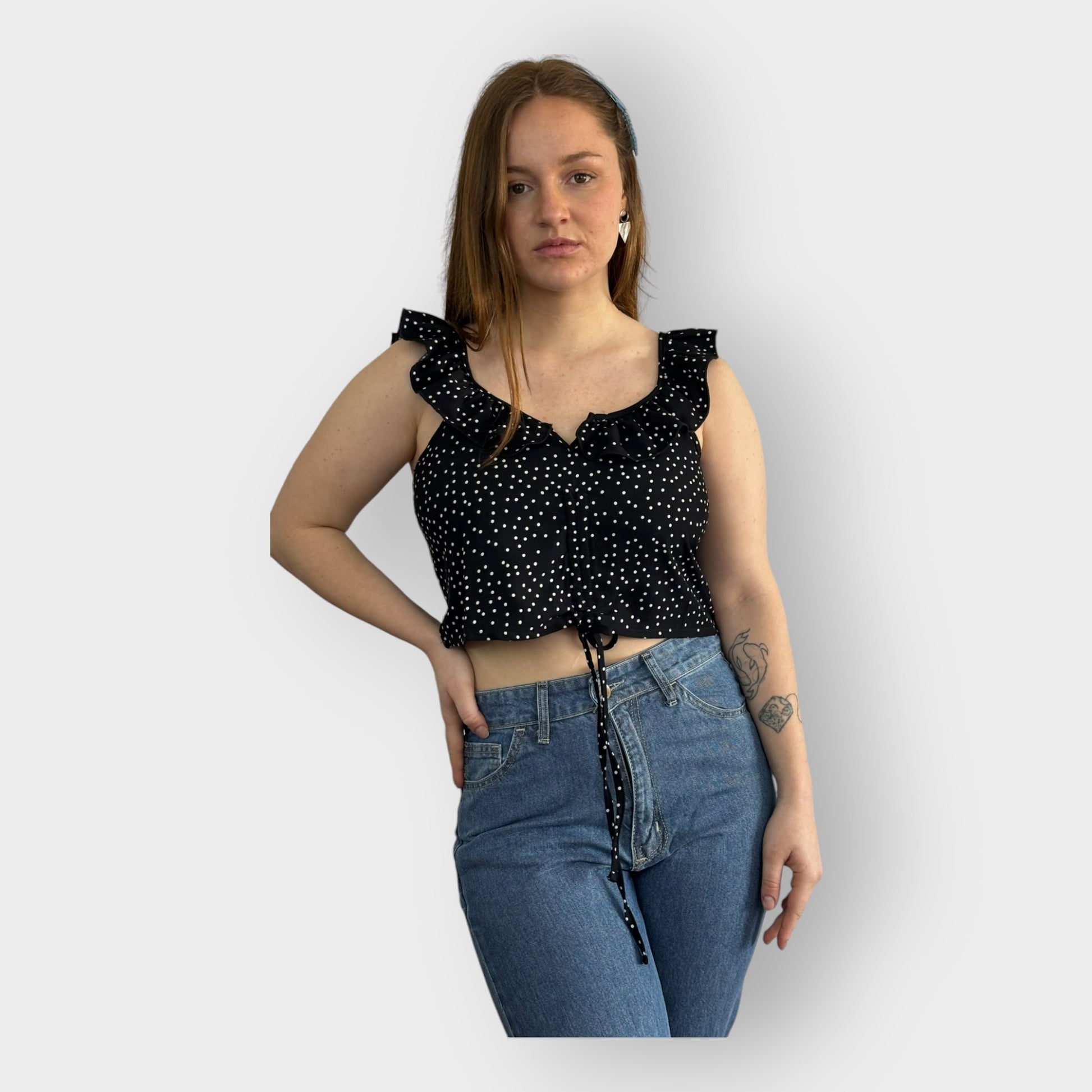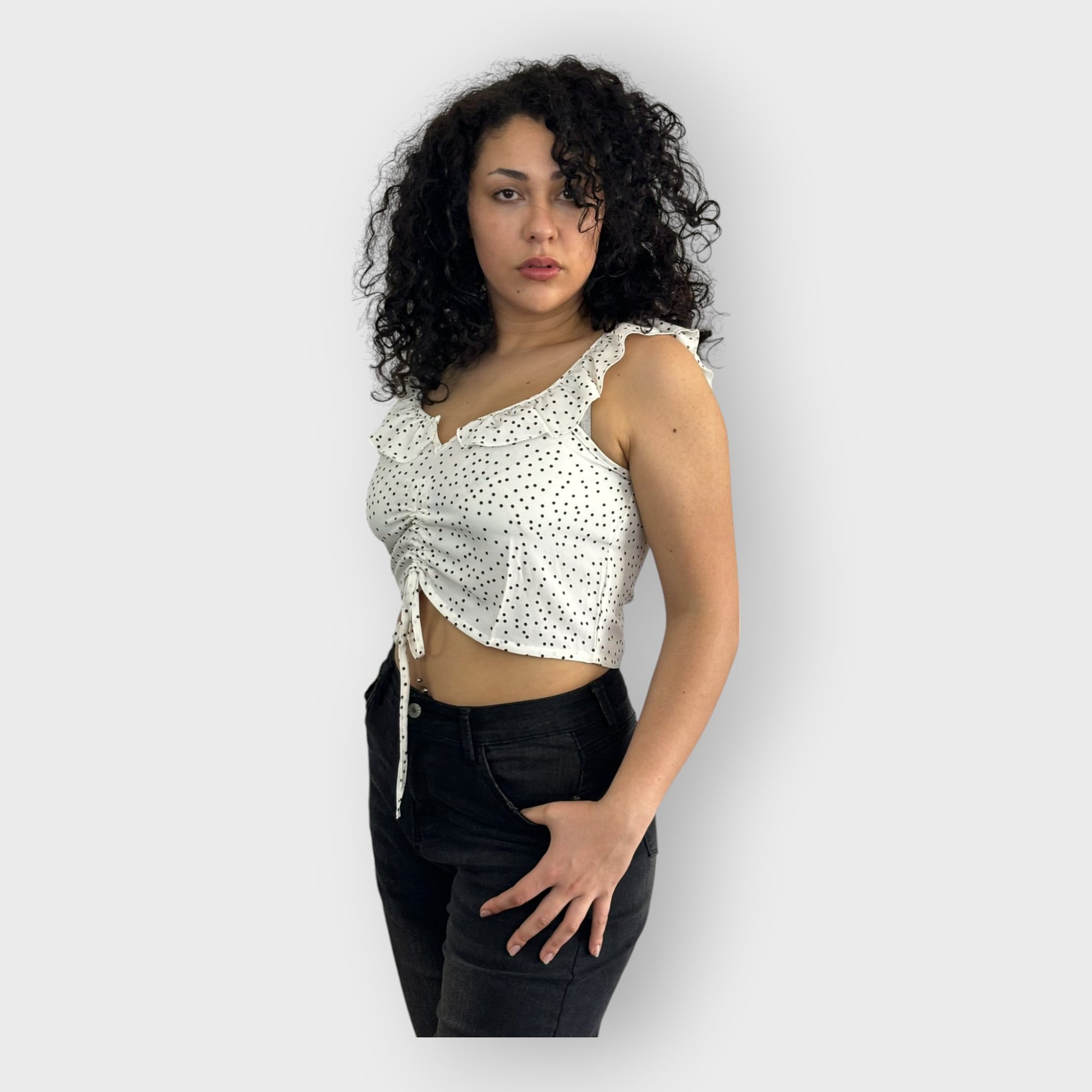 Este encantador top a lunares de ORA es la prenda perfecta para un look femenino y moderno. Disponible en colores negro, blanco y café con leche, cuenta con un delicado escote redondo adornado con un volado que le añade un toque romántico. En la parte delantera, una tira ajustable permite regular el largo del top, creando un fruncido elegante que termina en una moña o un nudo, según tu preferencia. Este top es ideal para combinar con jeans, faldas o pantalones, aportando estilo y frescura a cualquier conjunto.