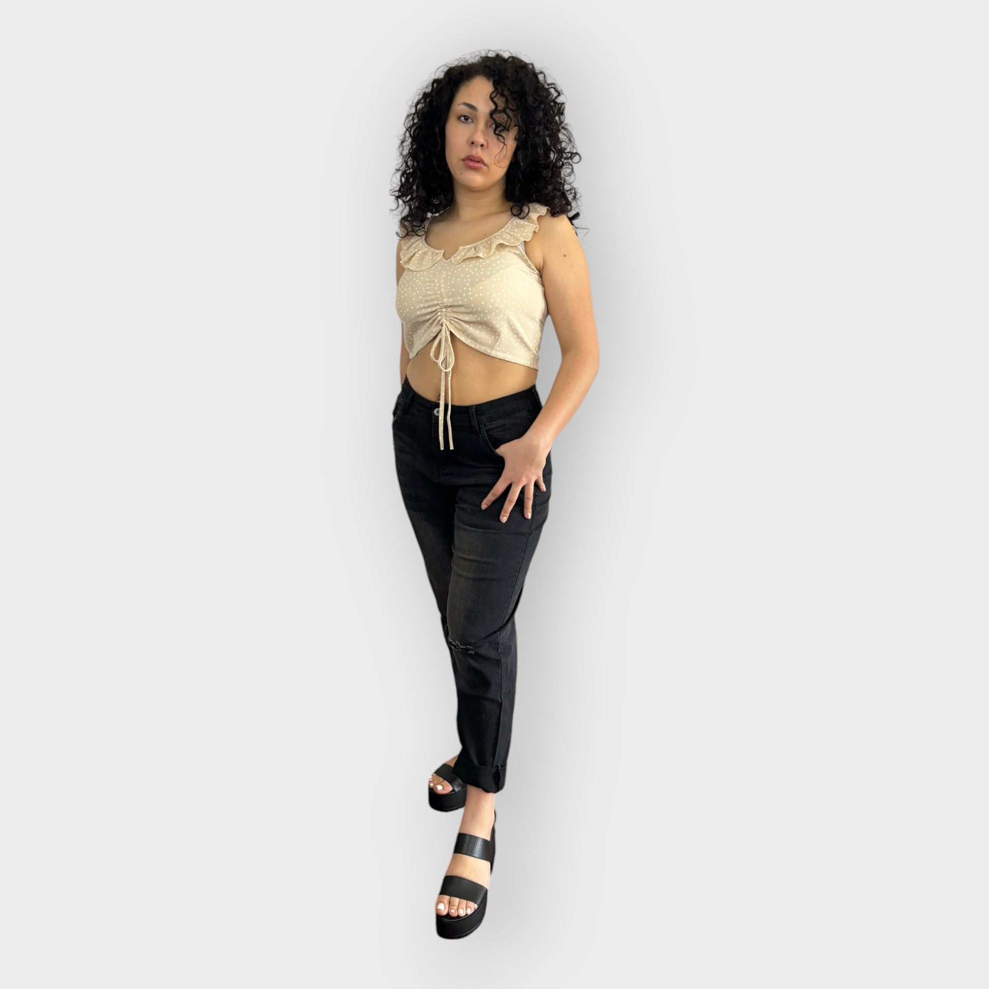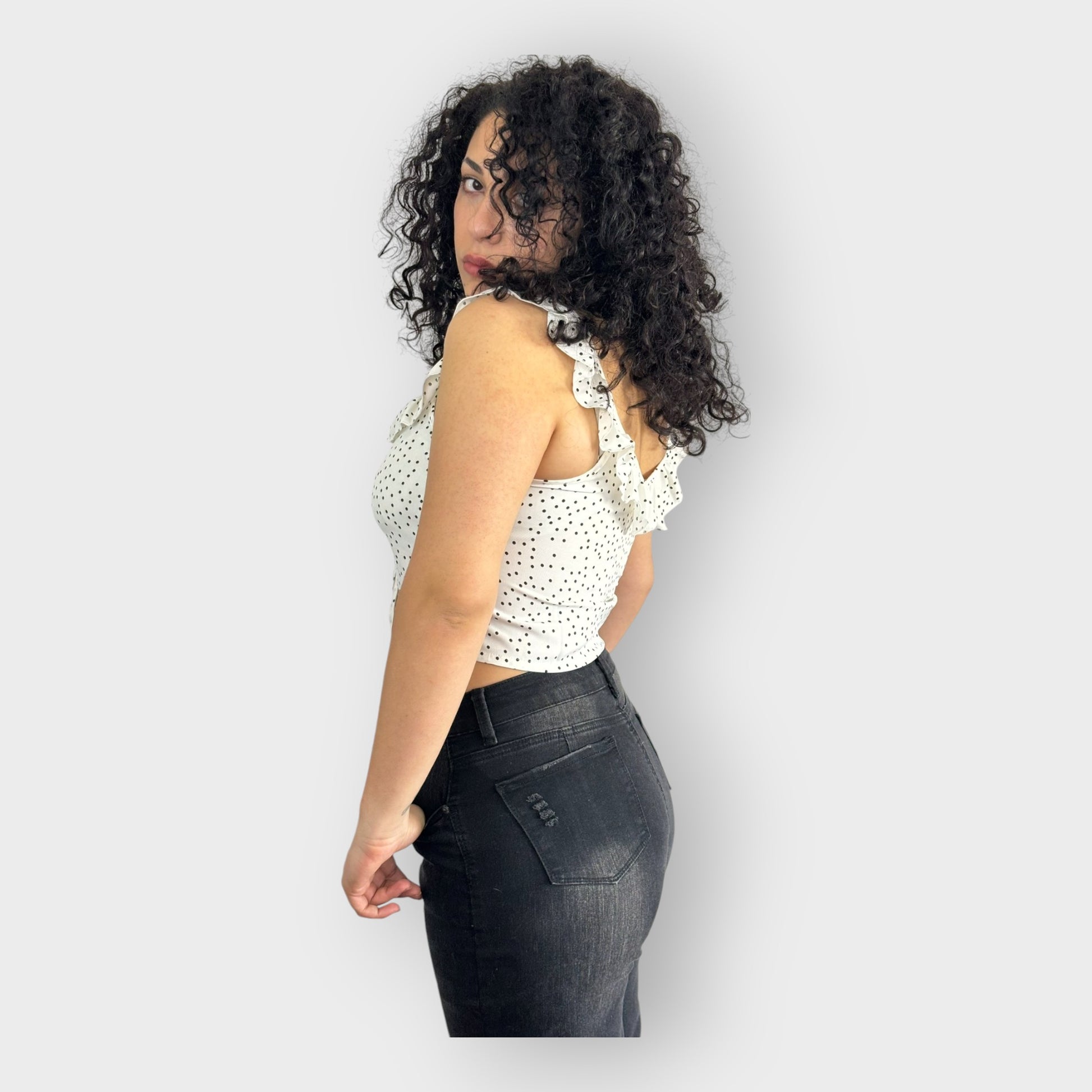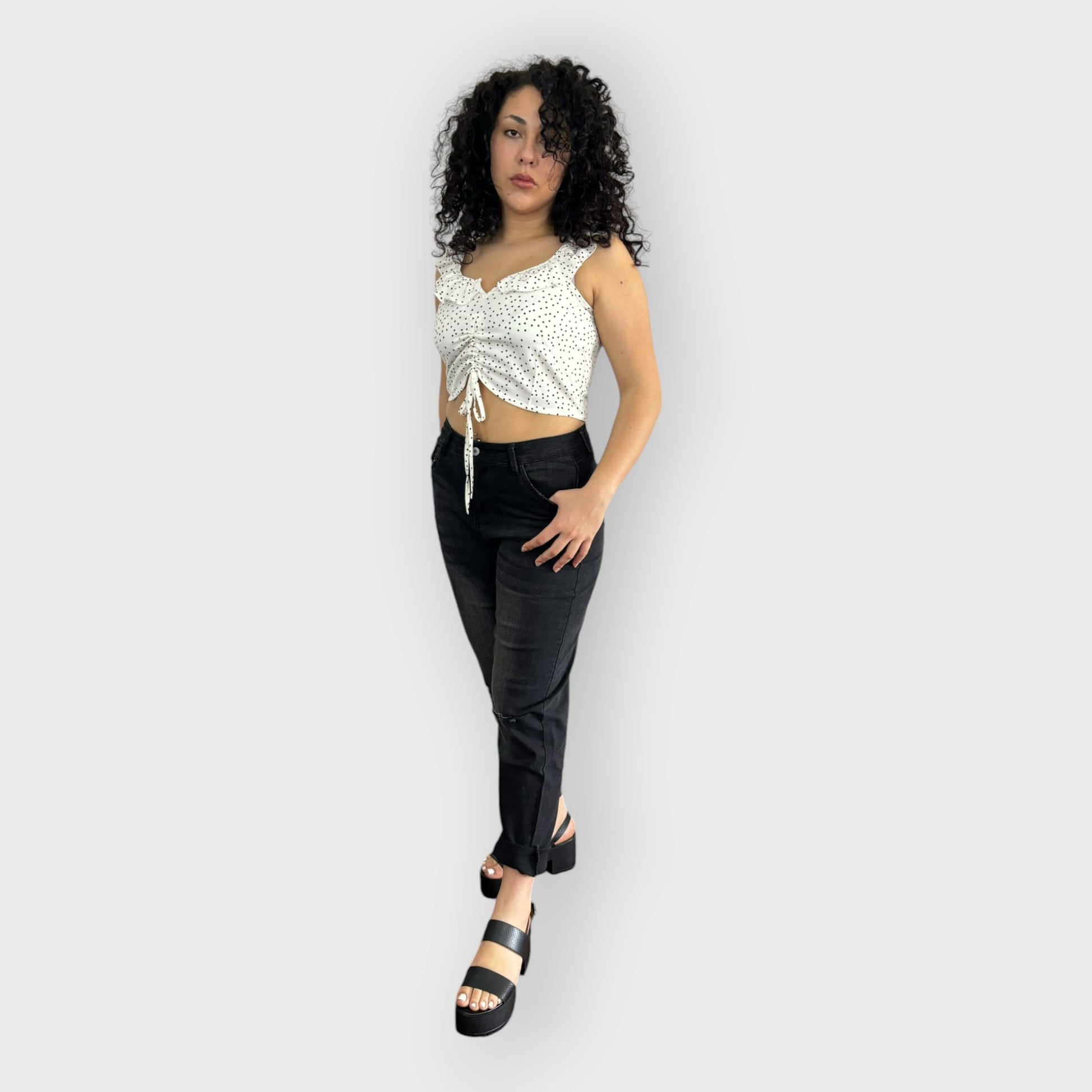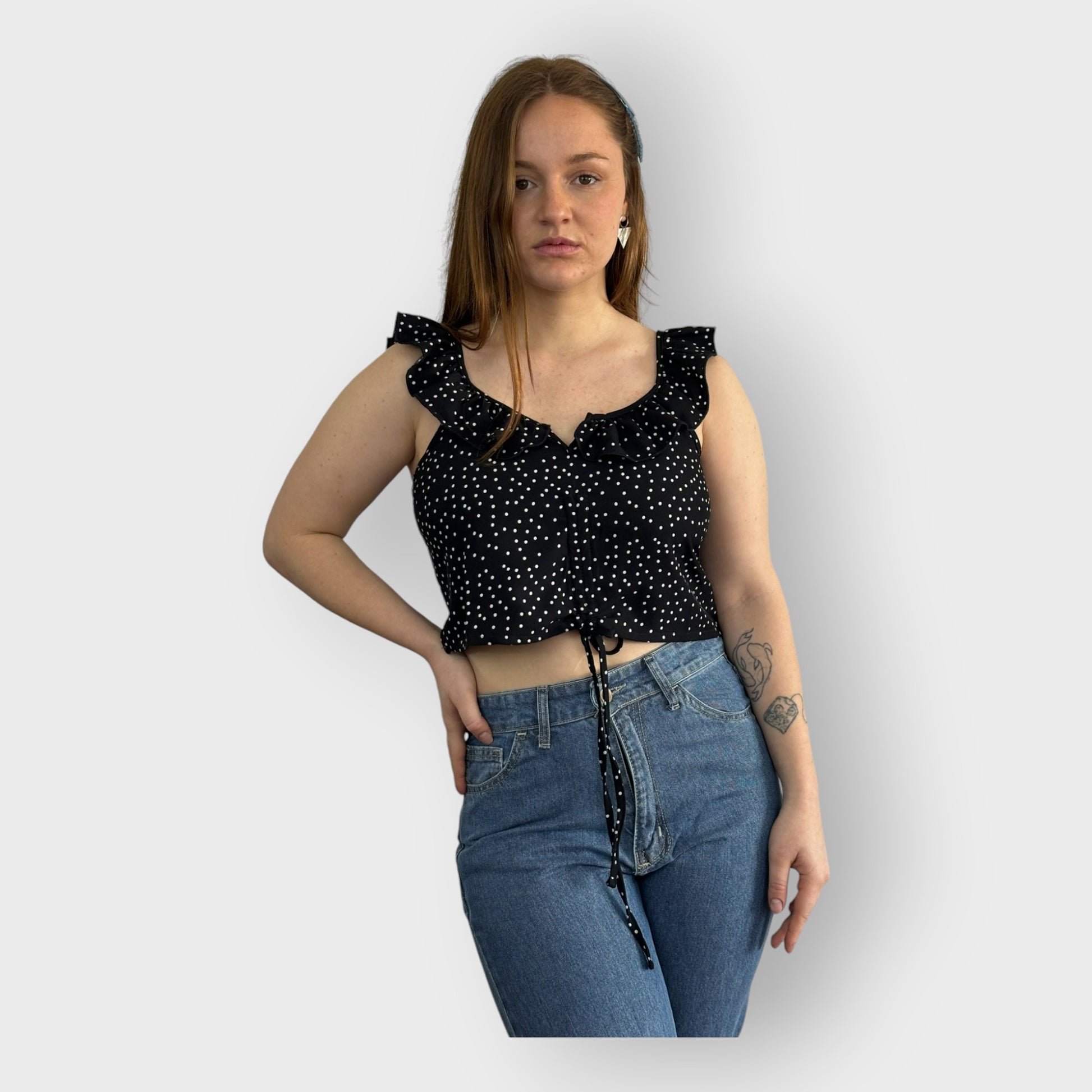 Este encantador top a lunares de ORA es la prenda perfecta para un look femenino y moderno. Disponible en colores negro, blanco y café con leche, cuenta con un delicado escote redondo adornado con un volado que le añade un toque romántico. En la parte delantera, una tira ajustable permite regular el largo del top, creando un fruncido elegante que termina en una moña o un nudo, según tu preferencia. Este top es ideal para combinar con jeans, faldas o pantalones, aportando estilo y frescura a cualquier conjunto.