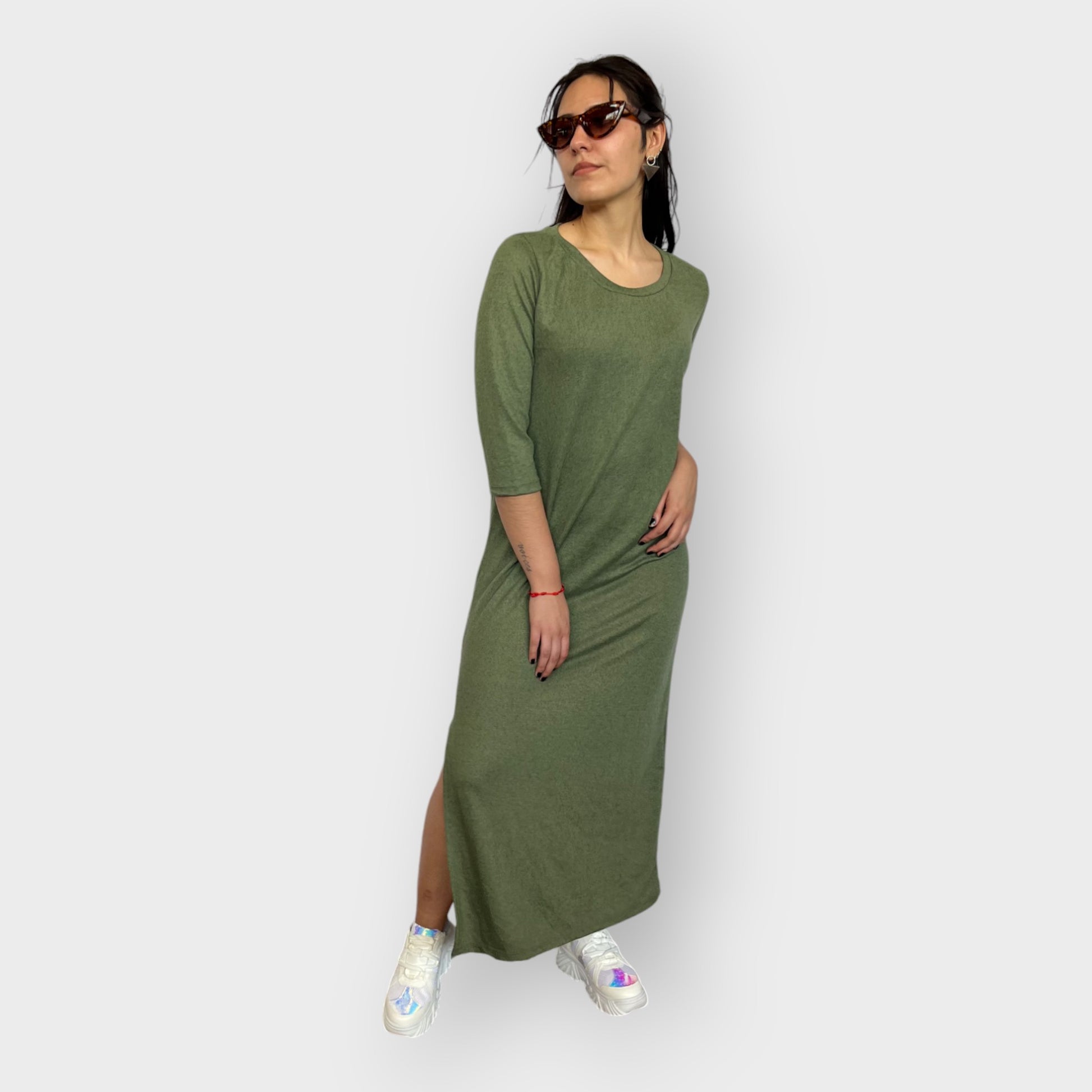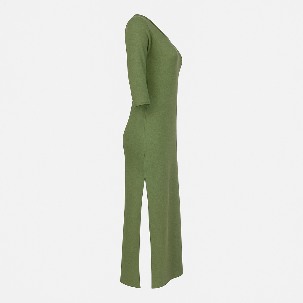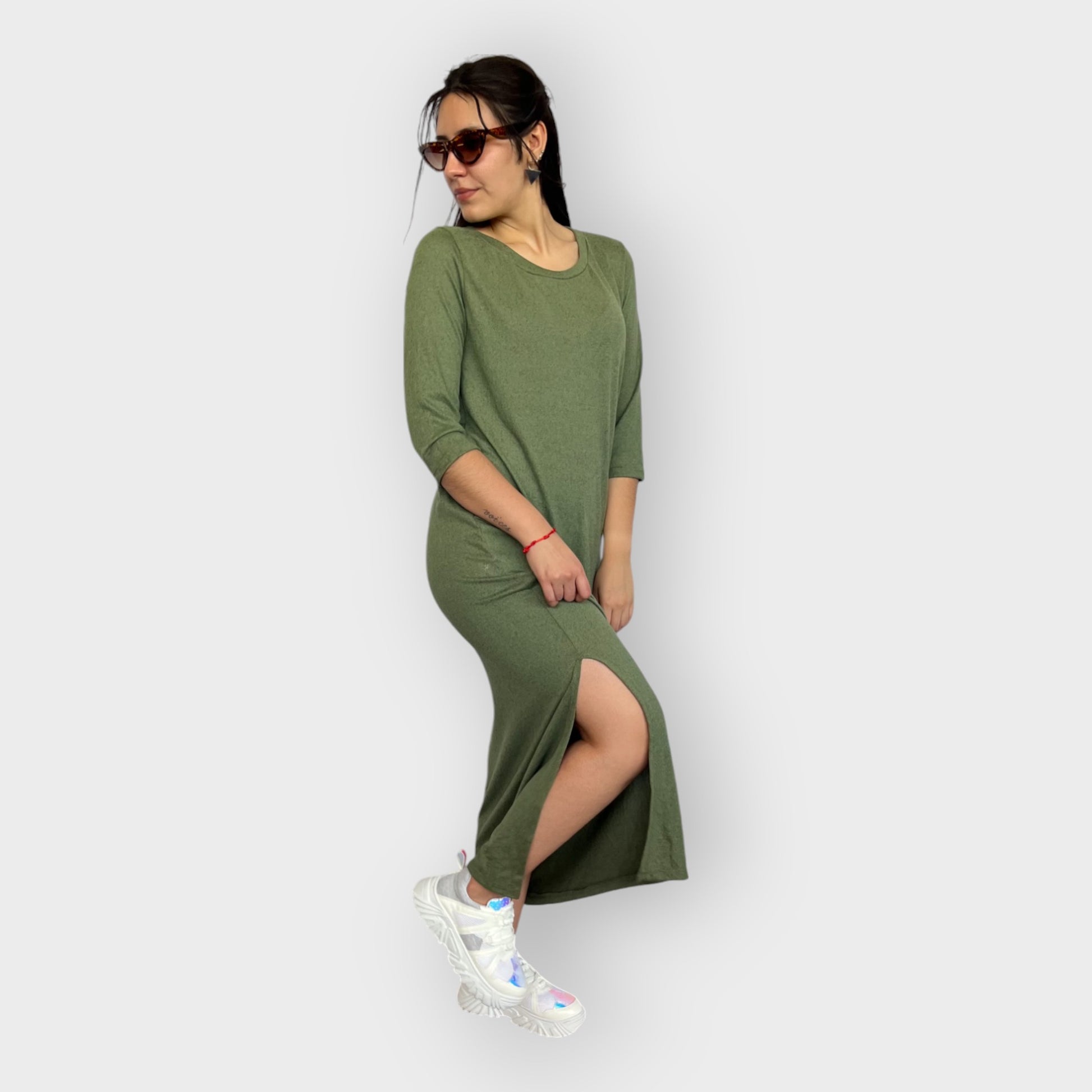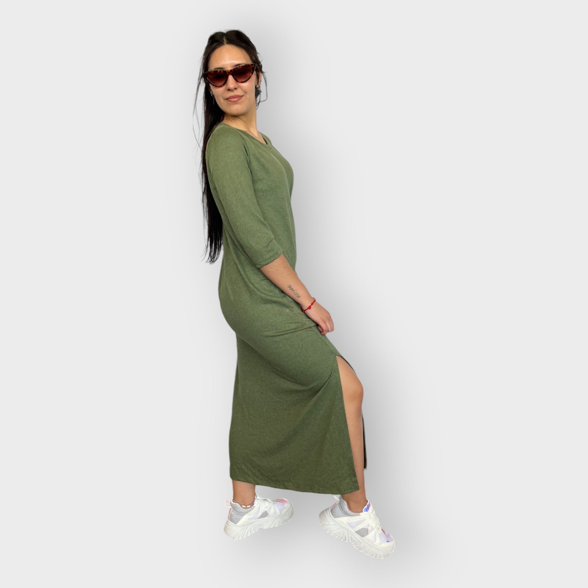 Este vestido largo es la definición de comodidad y estilo. Confeccionado en un tejido ligero y suave, brinda una sensación de confort inigualable en cada uso. Su diseño incluye mangas tres cuartos y un corte elegante que llega hasta los tobillos, añadiendo un toque cómodo. Un tajo lateral hasta la rodilla le da movimiento y un sutil aire atrevido. Con un escote a la base, este vestido está disponible en los colores oliva y negro, perfectos para combinar con distintos accesorios y ocasiones, manteniendo un look relajado o sofisticado según la ocasión .