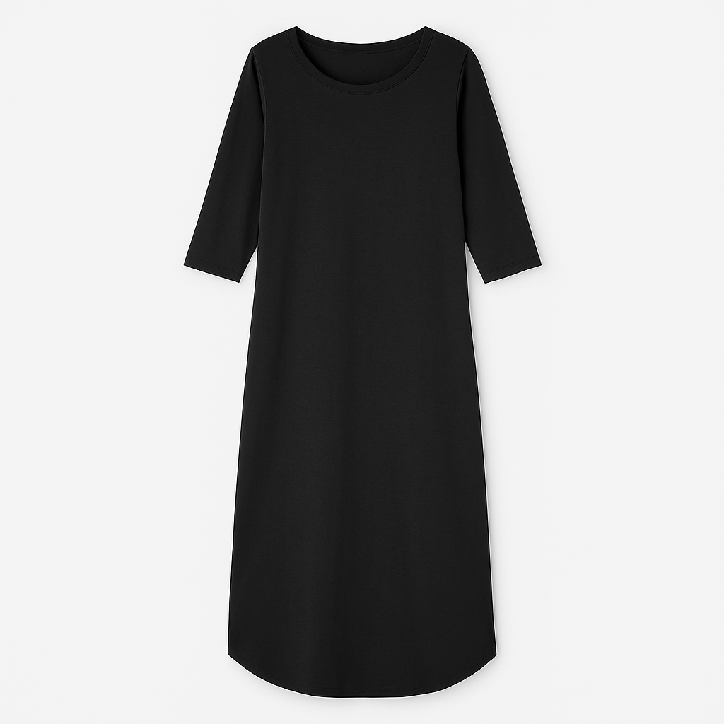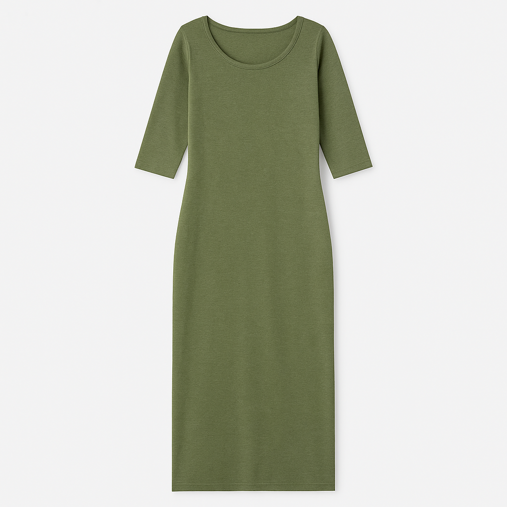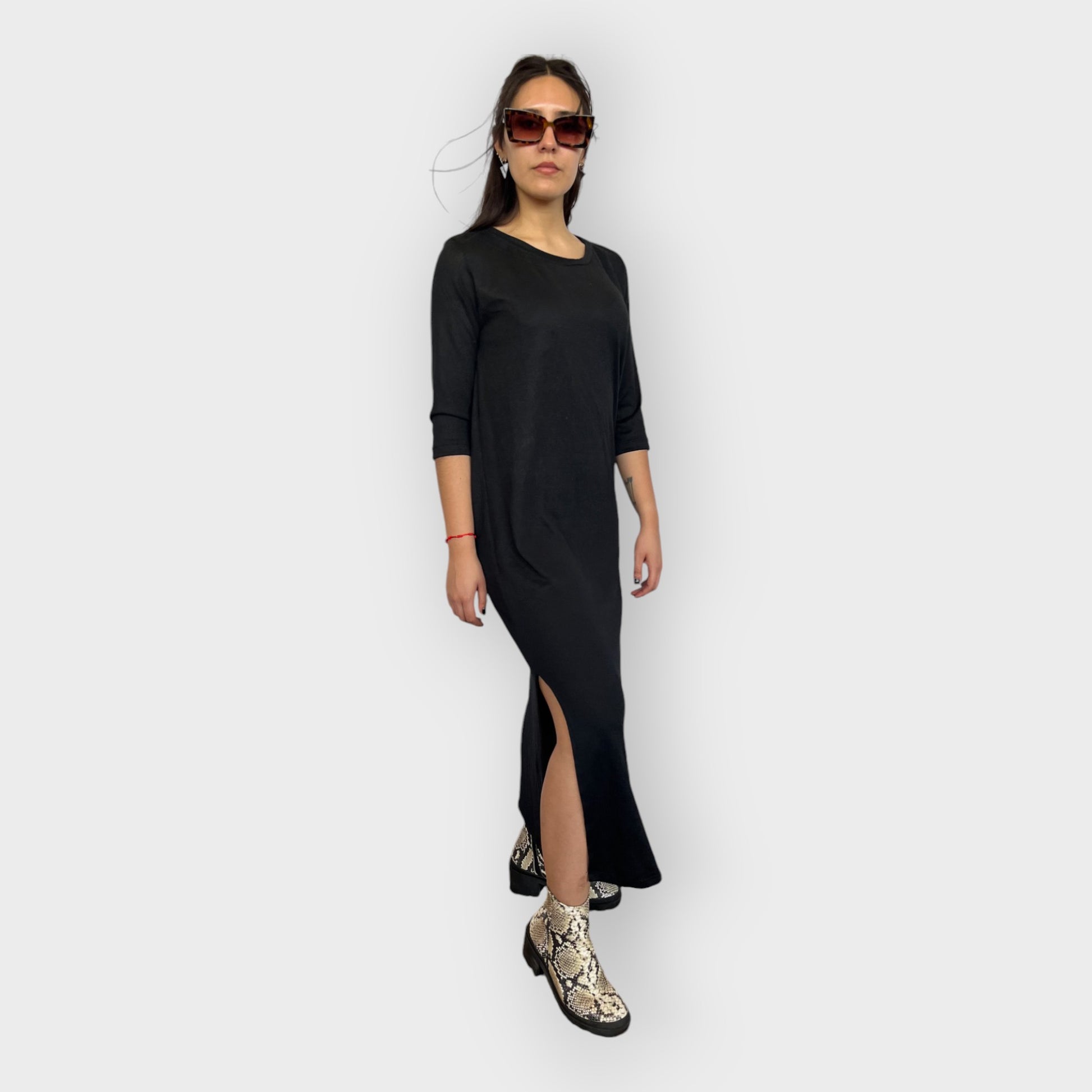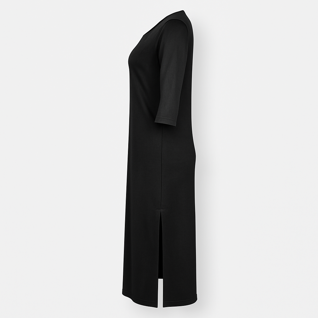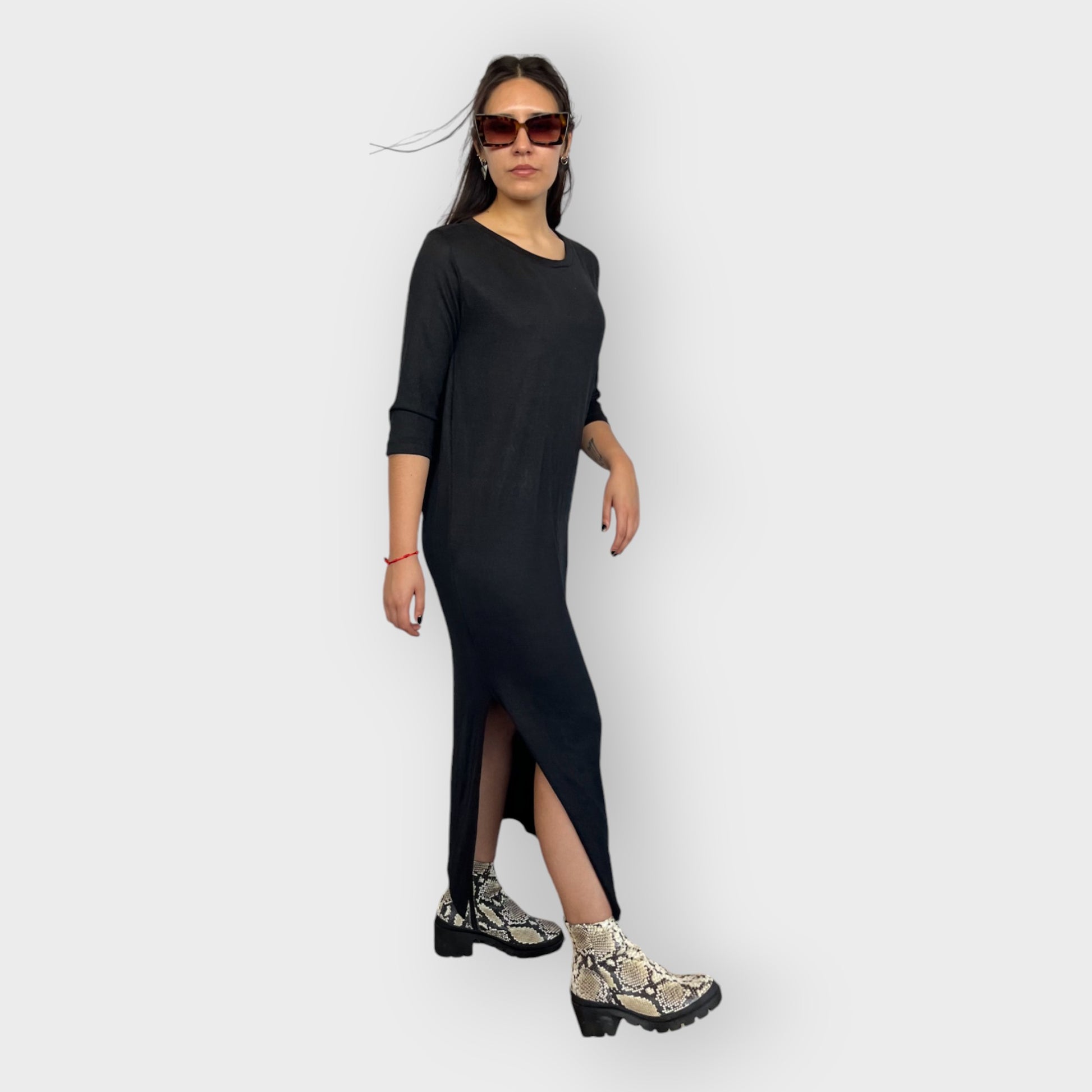 Este vestido largo es la definición de comodidad y estilo. Confeccionado en un tejido ligero y suave, brinda una sensación de confort inigualable en cada uso. Su diseño incluye mangas tres cuartos y un corte elegante que llega hasta los tobillos, añadiendo un toque cómodo. Un tajo lateral hasta la rodilla le da movimiento y un sutil aire atrevido. Con un escote a la base, este vestido está disponible en los colores oliva y negro, perfectos para combinar con distintos accesorios y ocasiones, manteniendo un look relajado o sofisticado según la ocasión .